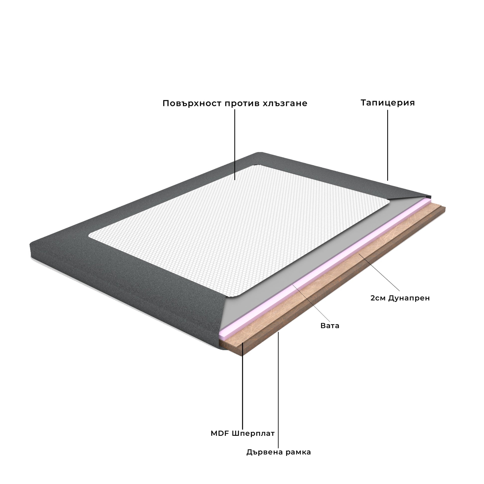 2 см дунапрен + 1 см вата – омекотява и подобрява усещането при допир.